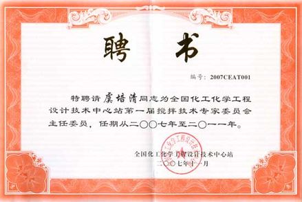 虞培清總經(jīng)理:全國化工化學(xué)工程設(shè)計(jì)技術(shù)中心站攪拌技術(shù)專家委員會主任委員聘書