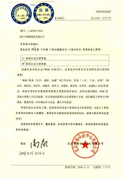 2007年11月26日~27日,北京世標(biāo)認(rèn)證中心專家組對(duì)我公司ISO9001標(biāo)準(zhǔn)質(zhì)量管理體系進(jìn)行了監(jiān)督審核,審核組專家對(duì)我公司領(lǐng)導(dǎo)和員工在質(zhì)量意識(shí)提高方面、基礎(chǔ)設(shè)施和工作環(huán)境改善等方面給予好評(píng),同時(shí)對(duì)需改進(jìn)的問題也提出了明確要求。最后給出審核結(jié)論:企業(yè)質(zhì)量管理體系保持良好,保持認(rèn)證注冊(cè)資格。