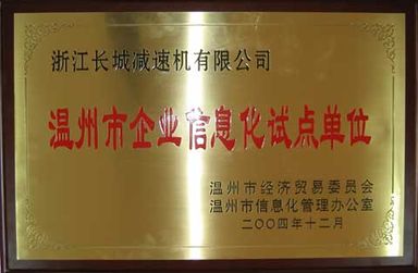 04年11月10日,溫州市經(jīng)貿(mào)局經(jīng)濟貿(mào)易委員會領(lǐng)導(dǎo)來我們公司視察。對我們公司的信息化建設(shè)情況作了一個考評,在聽取公司IT部經(jīng)理陳德建對公司信息化建設(shè)作了詳細的介紹后,經(jīng)貿(mào)局領(lǐng)導(dǎo)又進行了嚴格的視察,最后對我們公司信息化建設(shè)予以肯定,并對我們公司信息化建設(shè)的不足處提出了希望。于11月27日正式確定,我們公司為“溫州市企業(yè)信息化試點單位”。并于05年4月15日正式發(fā)放了牌匾。
