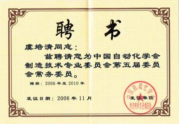 虞培清總經(jīng)理被聘為中國自動化學會制造技術(shù)專委會第五屆委員會常務委員