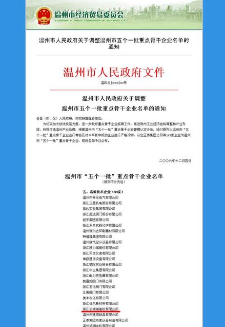 今年經(jīng)溫州市的“五個一批”評審小組考核及嚴格評審,全市共有147家企業(yè)被認定為溫州市“五個一批”重點骨干企業(yè),其中高新技術(shù)企業(yè)全市有33家,我公司列為其中之一。