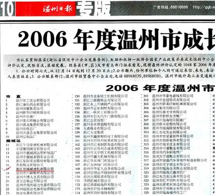 2006年12月14日,《溫州日報》第10版刊登了“2006年度溫州市成長型中小企業(yè)入選名單”,我公司位列第17位。
