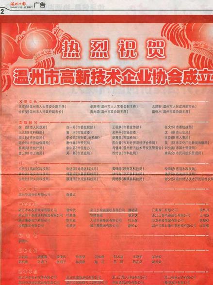 由2009年12月1日《溫州日報》2 版知:溫州市高新技術(shù)企業(yè)協(xié)會現(xiàn)已成立,我公司董事長虞培清被任命為協(xié)會副會長,公司喜為副會長單位和理事單位。 2009年12月1日《溫州日報》2版