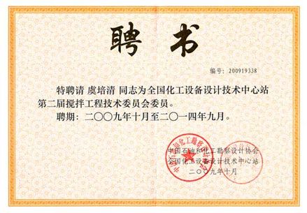“全國化工設(shè)備設(shè)計技術(shù)中心站第二屆攪拌工程技術(shù)委員會委員”聘書 “第一屆全國機械密封標準化技術(shù)委員會副主任委員”聘書