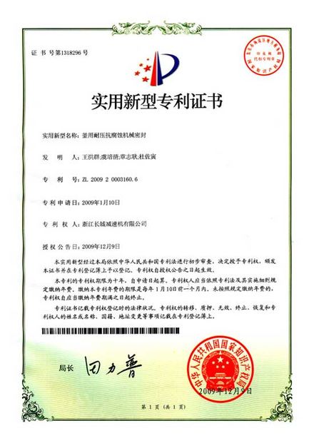 ZL 2009 2 0003160.6   釜用耐壓抗腐蝕機械密封 ZL 2009 2 0003159.3   具有自提升功能的攪拌傳動裝置